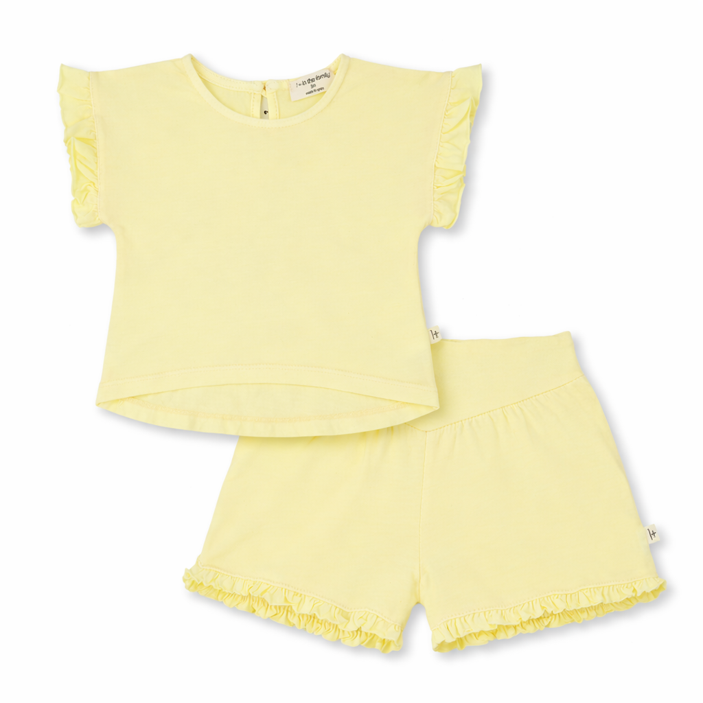 A sweet lemon-yellow ruffle-sleeve top paired with matching ruffle-trim shorts—perfect for keeping little girls cool, comfy, and adorable on sunny days. 🍋
