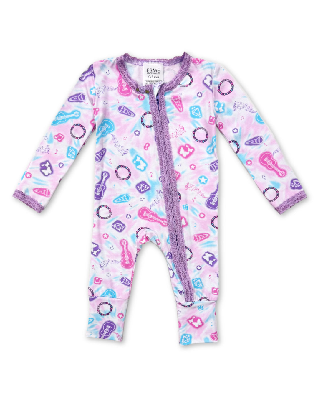 These cozy popstar-themed footie pajamas shine with colorful microphones, guitars, stars, and music notes—perfect for little superstars who love to rock bedtime in style.