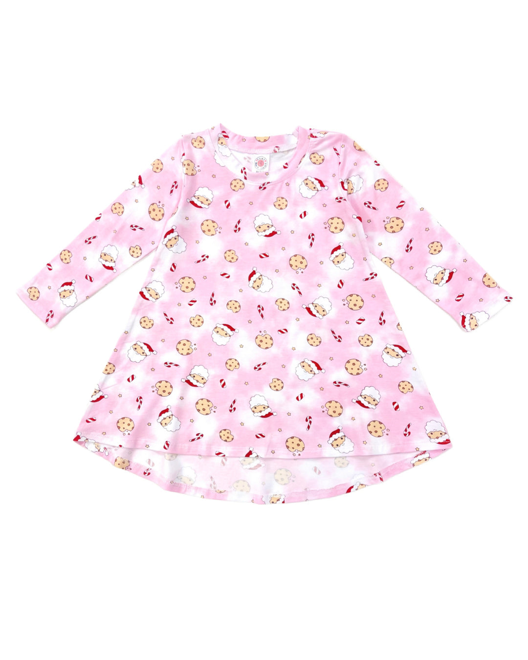 Santa Cookie Nightgown – A pink holiday nightgown sprinkled with Santa faces, cookies, and candy canes, perfect for festive and cozy Christmas mornings.