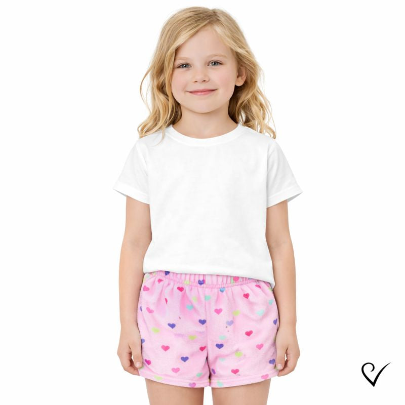 Soft pink plush shorts sprinkled with colorful heart confetti, designed with a comfy elastic waistband for playful lounging, sleepovers, and all-day cozy comfort. πŸ’•πŸŒˆ