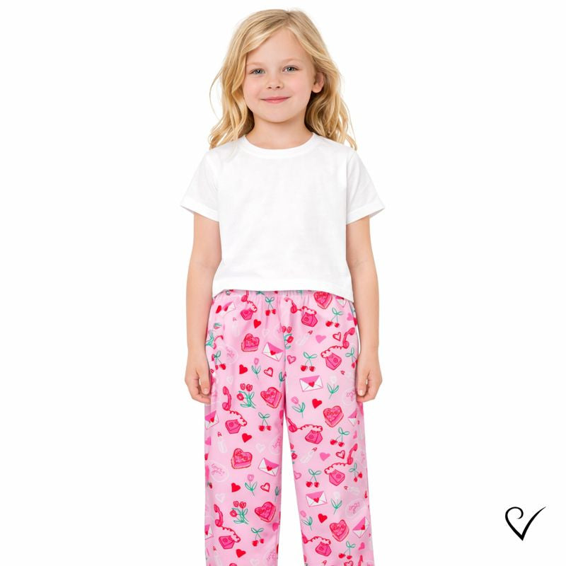 Super-soft plush pants in a sweet pink Love Doodles print, featuring playful hearts, cherries, and love notes with a comfy elastic waistband—perfect for cozy lounging, sleepovers, and all-day comfort. 💕