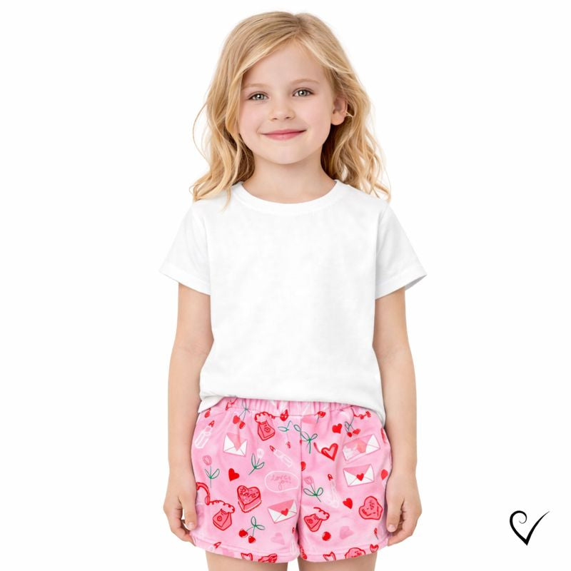 Super-soft plush shorts in a sweet pink hue, covered in playful love doodles with a comfy elastic waistband—perfect for lounging, sleeping, or all-day cozy cuteness. 💗