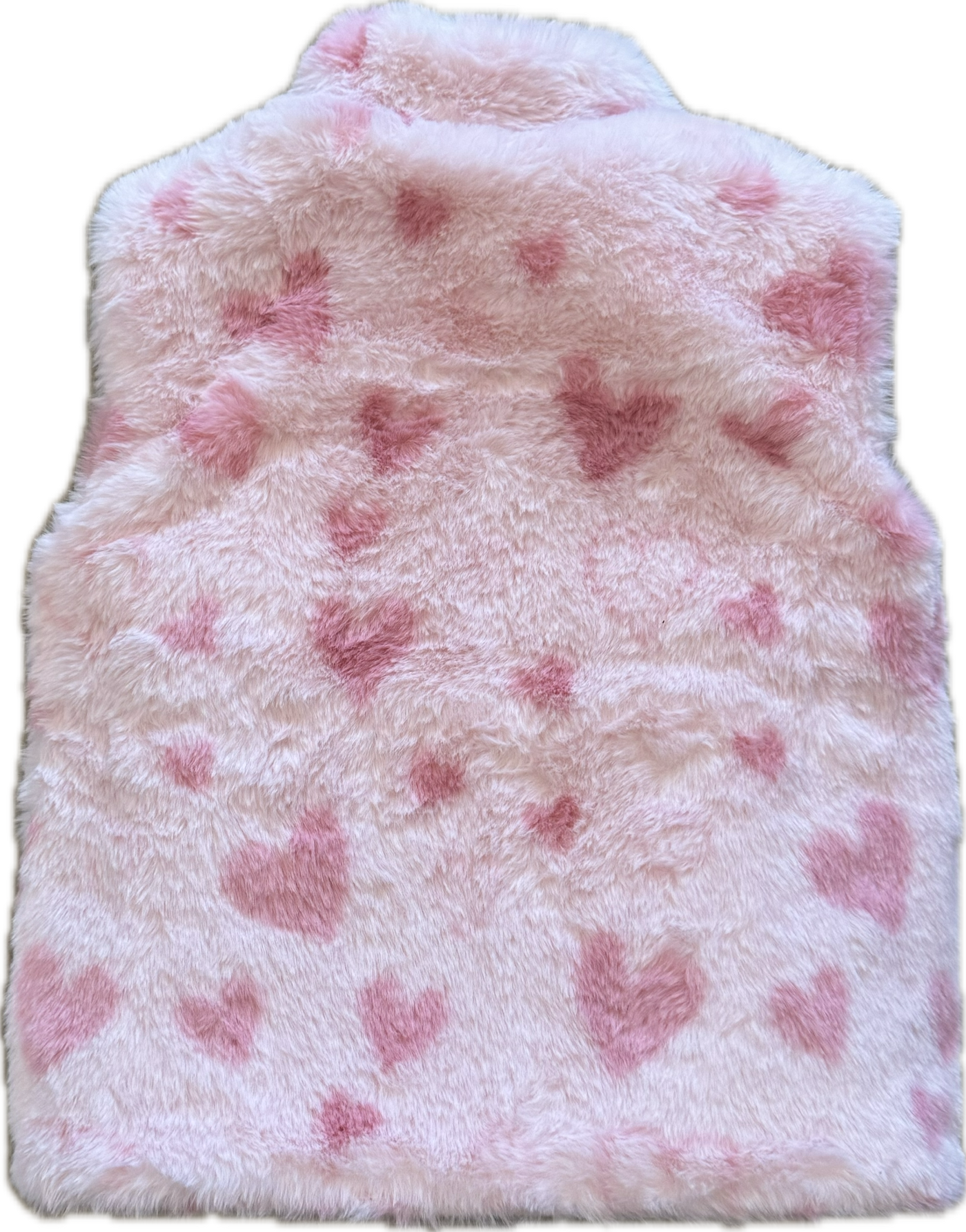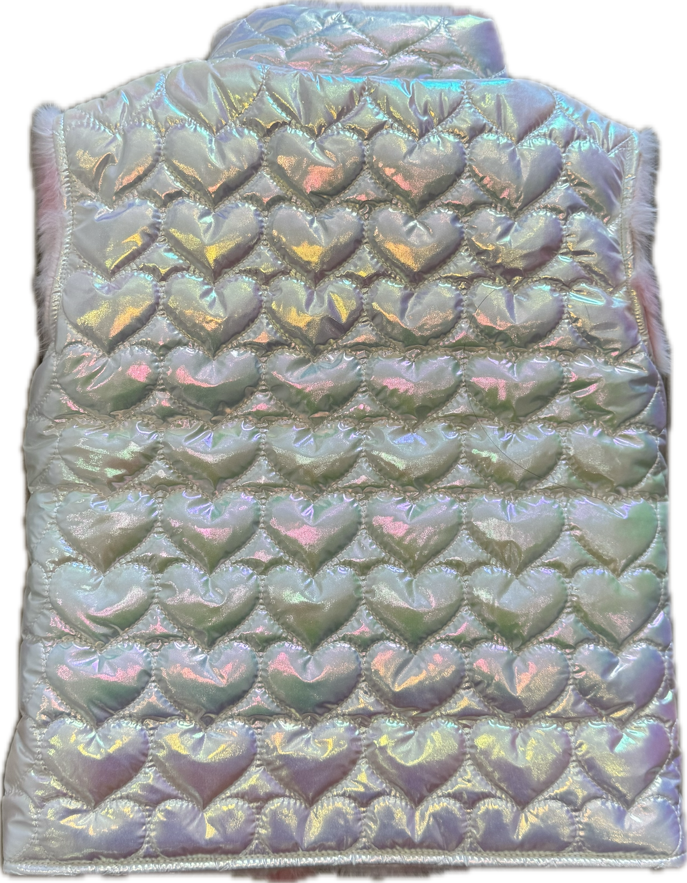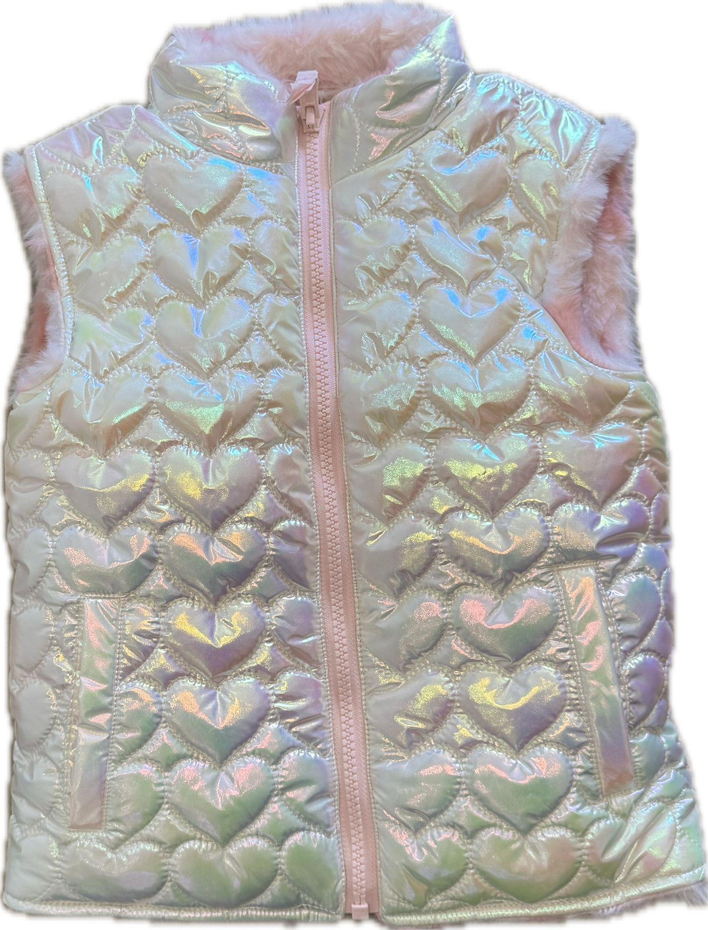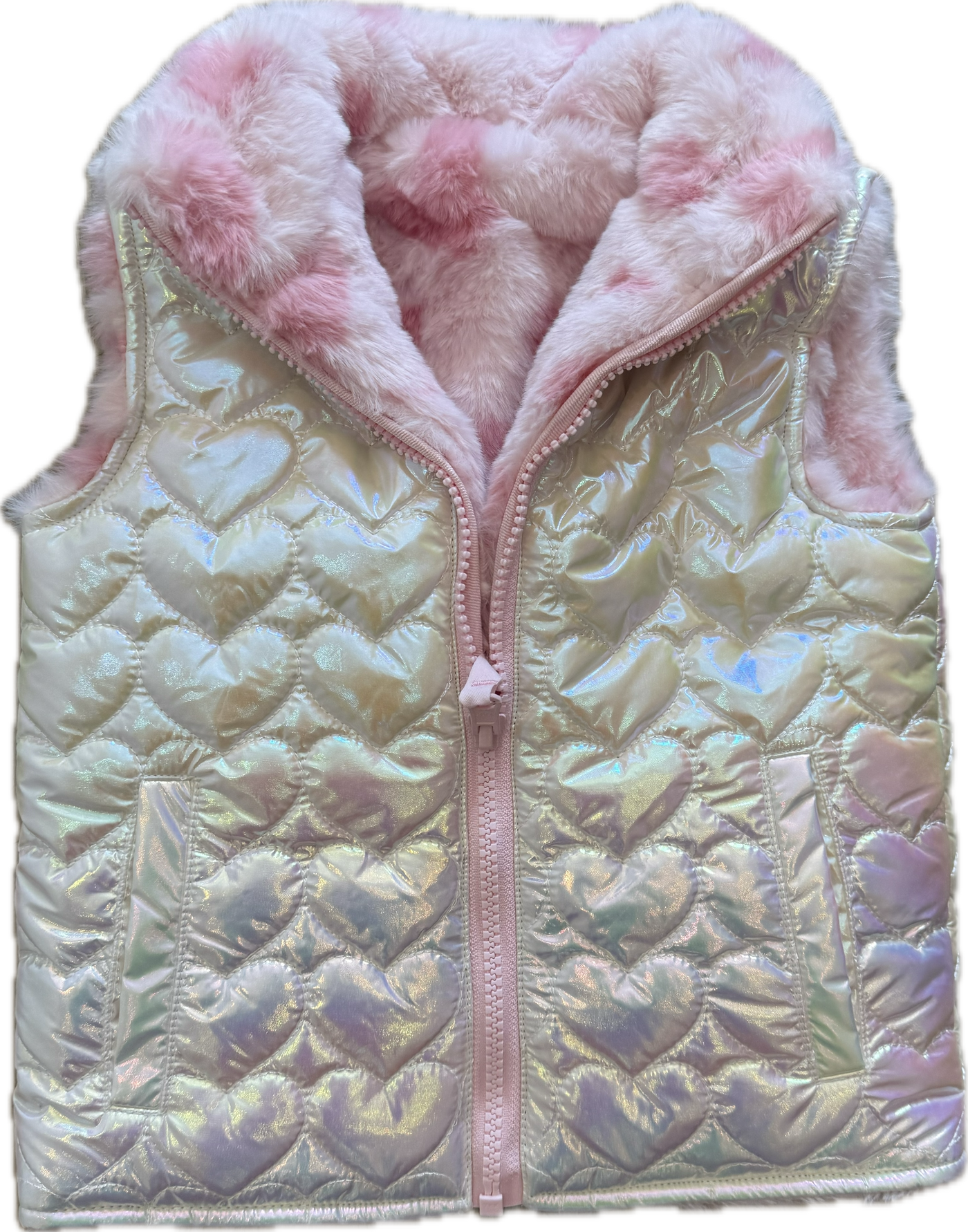 This adorable reversible vest features two lovable looks — one side a shiny heart-quilted iridescent finish, the other a soft pink faux fur with heart prints — perfect for keeping little ones cozy and cute all season long.