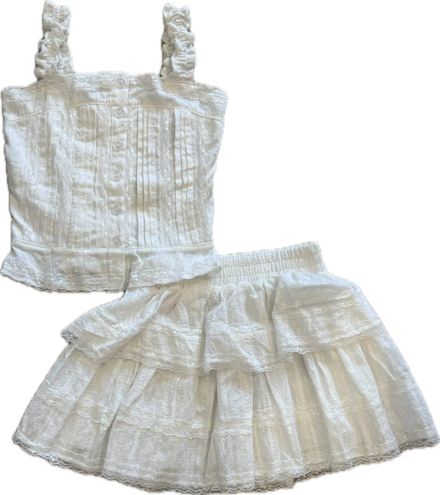 This sweet white lace two-piece set features a delicate ruffled cami and a tiered skirt with built-in shorts, making it a timeless, comfortable, and picture-perfect outfit for special days or everyday summer wear.