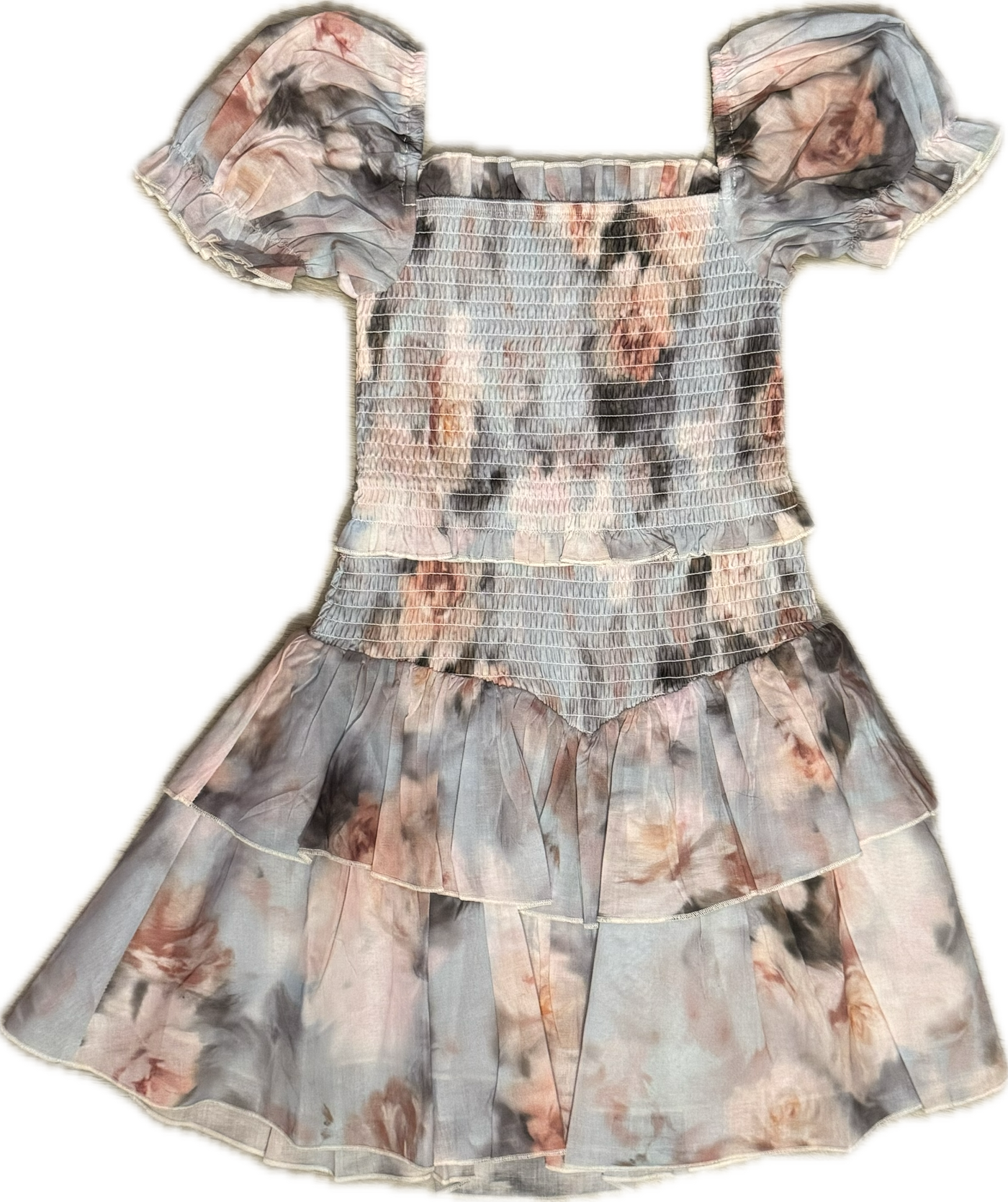 This dreamy girls’ dress features soft watercolor florals, puff sleeves, and a smocked bodice with tiered ruffle layers for a sweet, ethereal look.