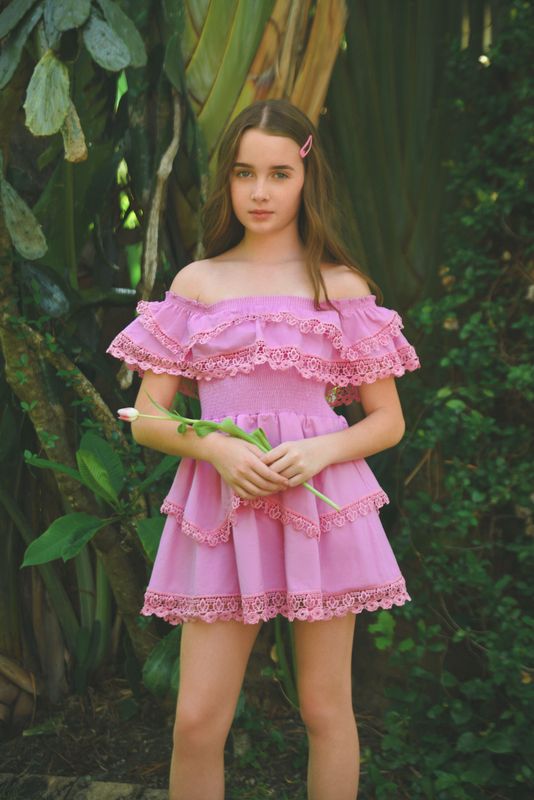 A sweet, twirl-ready pink dress with an off-the-shoulder ruffled neckline and delicate lace trim, perfect for special occasions, parties, and picture-perfect moments.