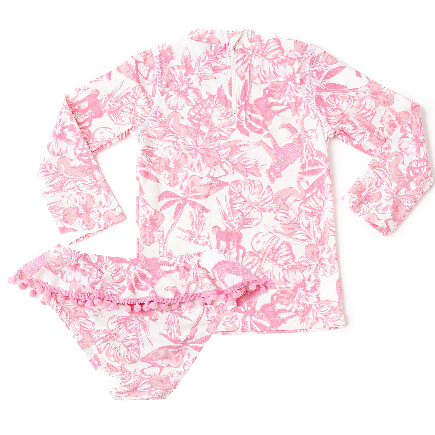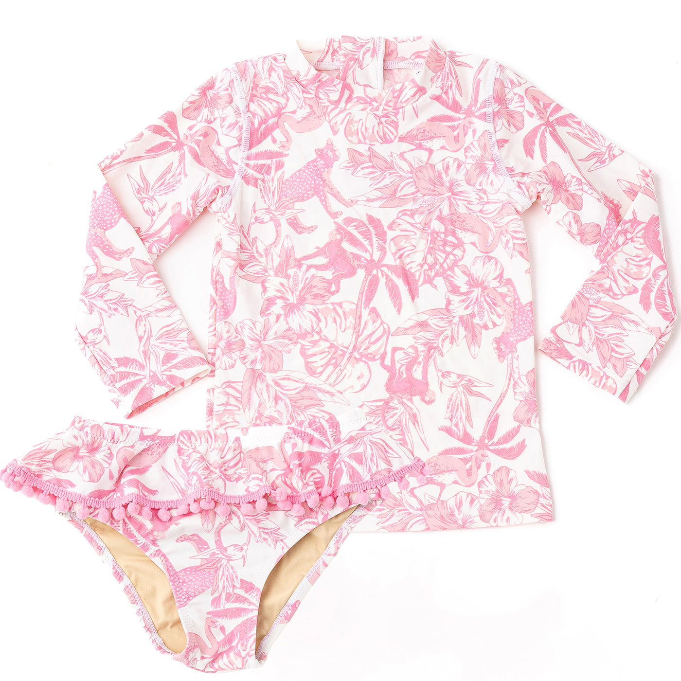 This adorable two-piece set pairs a long-sleeve rash guard with matching pom-trim bottoms, giving little girls extra sun protection and all-day comfort in a sweet pink tropical print moms will love.