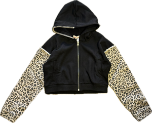 Vintage Havana- Black With Leopard Sleeve Cropped Hoodie