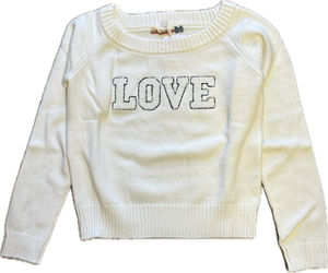 Soft and stylish ivory sweater for girls featuring the word "love" in ivory letters with a contrasting brown border, perfect for casual wear.