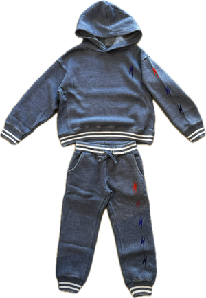 This bold mountain blue hoodie sweatpants set features striking lightning bolt designs that transition from red to blue to black, running down one sleeve and one pant leg, with an...